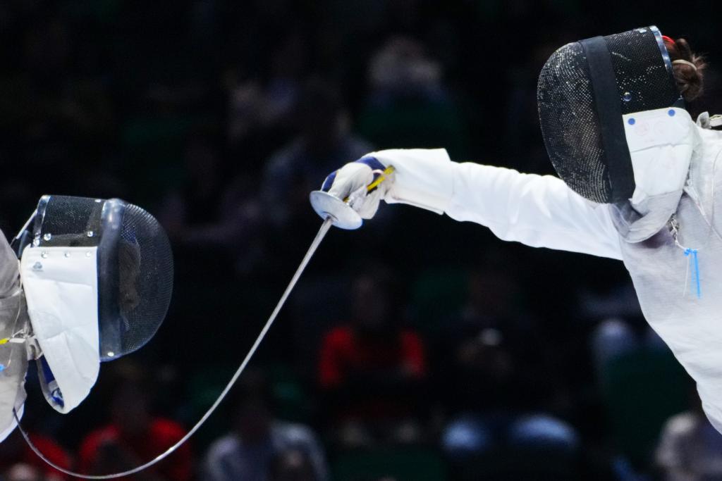 11月20日,江苏队选手霍兴欣(左)和广东队选手吴培林在女子花剑团体铜牌赛中。