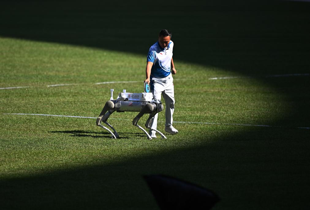 11月16日,在田径男子十项全能铁饼比赛中,机器人在运送铁饼。