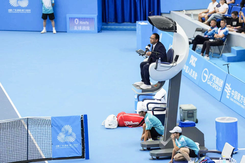 这是11月15日在广东珠海横琴网球中心拍摄的智能电动升降裁判椅。