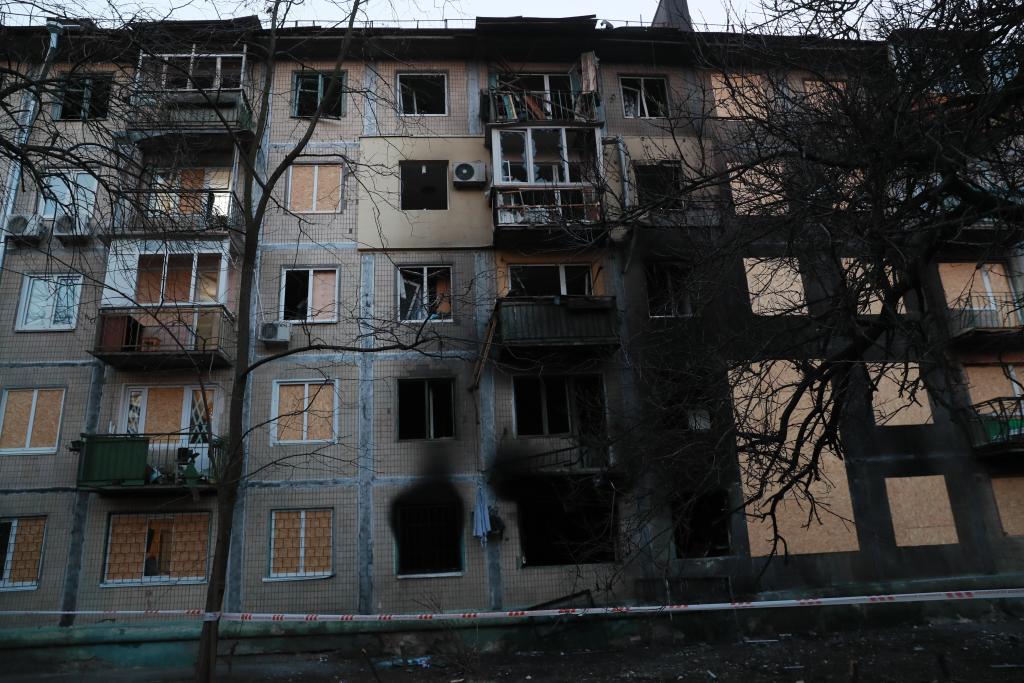 这是11月14日在乌克兰首都基辅市第聂伯区拍摄的遭受空袭损毁的房屋。新华社记者李东旭摄