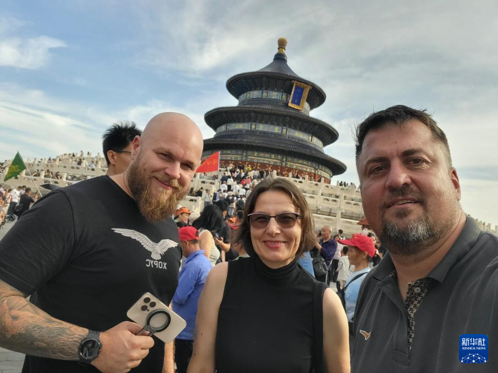 图为塞尔维亚制片人博什科·科扎尔斯基(右)与北京塞尔维亚文化中心主任塔季扬娜·索尔达特(中)在北京天坛留影。新华社发(受访者供图)