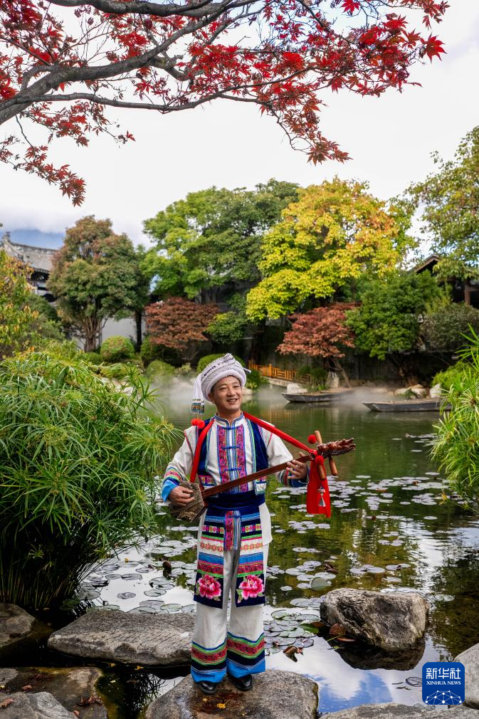 11月23日,石宝山歌会省级传承人李兆元在2025非遗品牌推广周上弹唱。新华社记者 胡超 摄