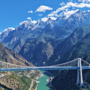 这是11月21日拍摄的虎跳峡金沙江铁路大桥。大桥全长882.5米,起于玉龙雪山隧道出口,止于哈巴雪山隧道进口,是丽香铁路的重点控制性工程(无人机照片)。
