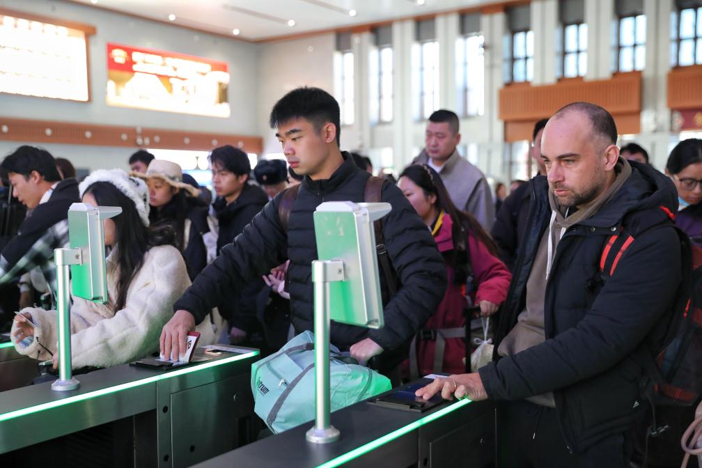 11月20日,旅客在云南香格里拉站通过检票口乘车。