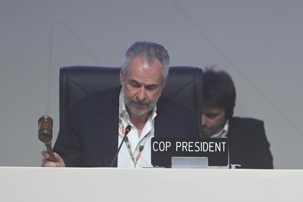 11月22日,在巴西贝伦举行的《联合国气候变化框架公约》第三十次缔约方大会(COP30)上,大会主席多拉戈敲槌确认会议决定。新华社发卢西奥·塔沃拉摄