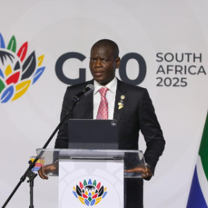 11月22日,在南非约翰内斯堡,南非国际关系与合作部长罗纳德·拉莫拉在记者会上发言。新华社记者陈为摄