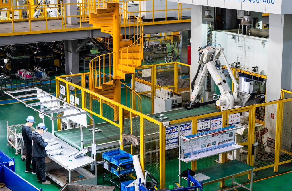 11月14日,在位于芜湖市湾沚区的安徽世圆新能源科技有限公司,工业机器人在冲压自动化线上作业。