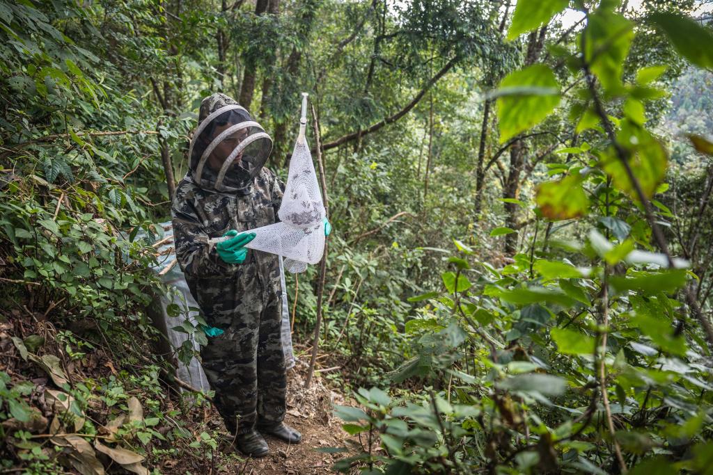 11月19日,在云南省保山市龙陵县龙山镇河头村,村民给胡蜂喂蜂蜜水。