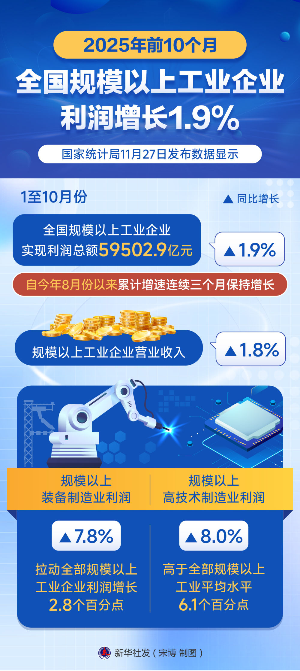 国家统计局11月27日发布数据显示,1至10月份,全国规模以上工业企业实现利润总额59502.9亿元,同比增长1.9%,自今年8月份以来累计增速连续三个月保持增长。