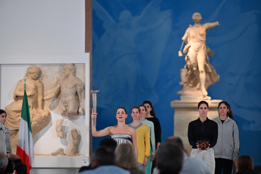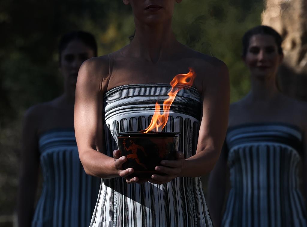 ↑11月26日,第一棒火炬手与扮演最高女祭司的演员玛丽·米娜交接火炬。新华社记者 李京 摄