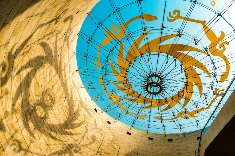 这是阳光透过成都金沙遗址博物馆陈列馆穹顶,在墙壁上投下太阳神鸟造型的影子(2022年3月10日摄)。新华社发(张艳 摄)