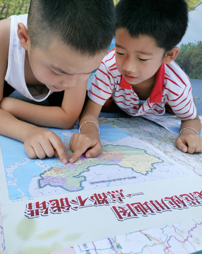 9岁的杨一川(左)与小伙伴一起在汉中市“全国测绘法宣传日”现场查看地图。新华社记者陶明摄