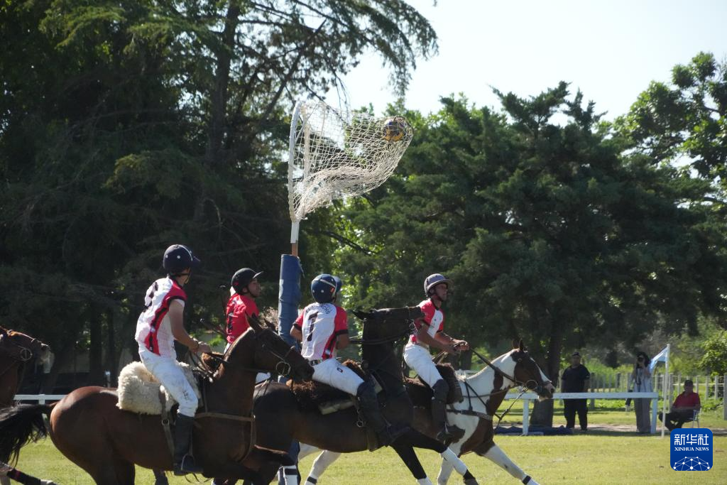 11月26日,在阿根廷布宜诺斯艾利斯省的五月军营,骑手在帕托比赛中进球得分。 新华社记者 张铎 摄