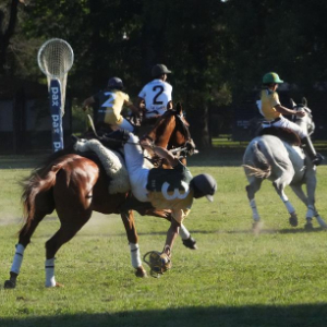八名骑手在宽阔的草坪上风驰电掣,其中一名骑手左手紧握着缰绳,右手平举着一个带有四个半圆形橡胶把手的排球,径直冲向位于草坪边缘的木桩,试图将球投入木桩上的圆环,三名骑手围绕在他身边掩护,对方四名骑手则围追堵截,伺机从他手中夺下排球。