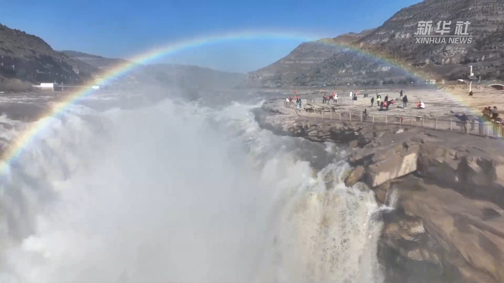 近日,黄河壶口瀑布景区出现“彩虹横卧”的独特冬景。一道彩虹横跨黄河两岸,时而可见“双虹并悬”,吸引众多游客驻足拍照。