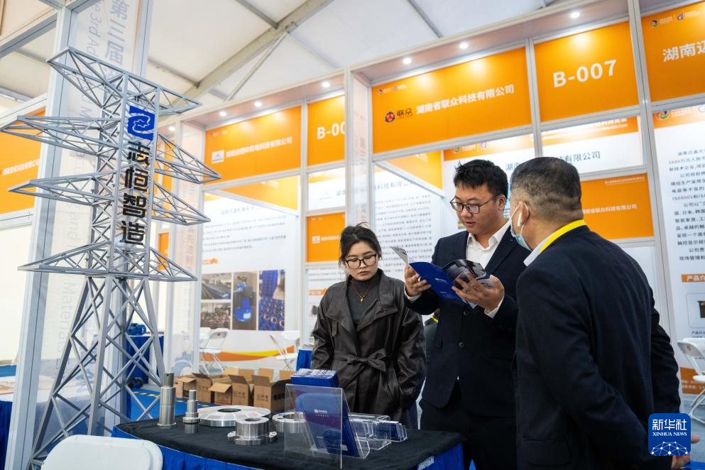 11月27日,在娄底经开区电力科技谷举行的第三届湖南省先进制造新材料博览会上,观众和展商就铁塔制作工艺与材料进行交流。新华社记者 陈思汗 摄