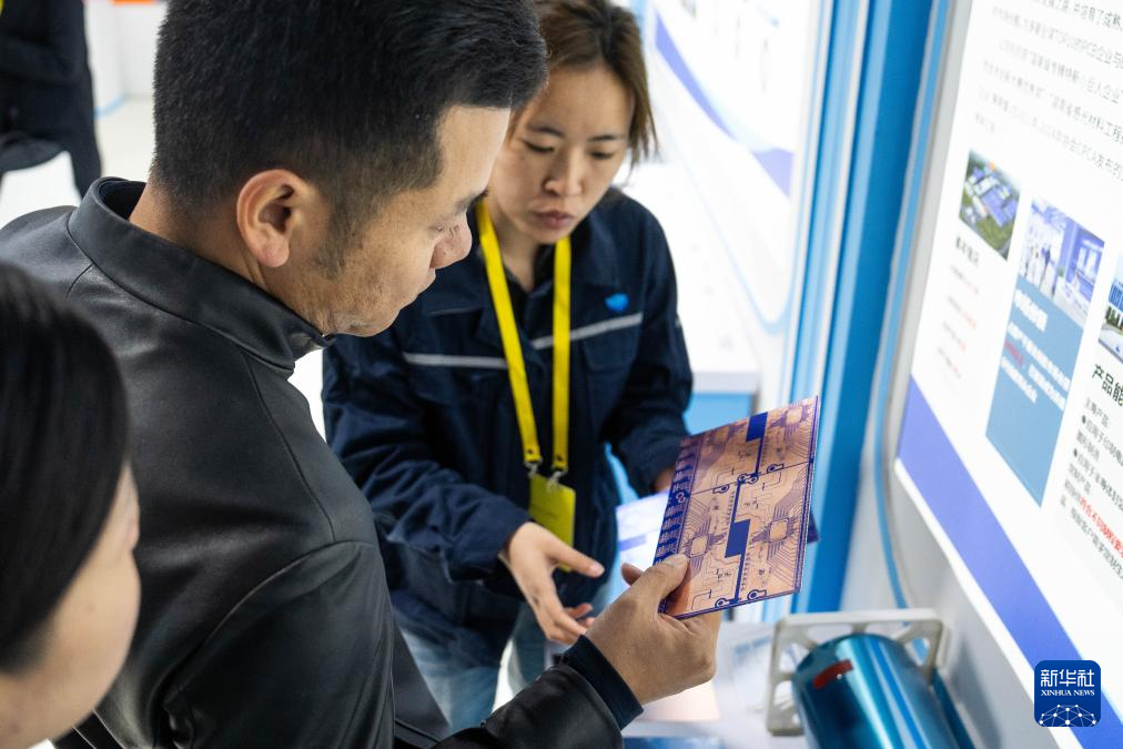 11月27日,在娄底经开区电力科技谷举行的第三届湖南省先进制造新材料博览会上,观众(中)在了解印制电路板。新华社记者 陈思汗 摄