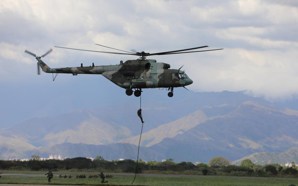 11月27日,在委内瑞拉马拉凯市的解放者空军基地举行的空军成立105周年纪念活动上,直升机起飞升空。新华社发(委内瑞拉国防部供图)