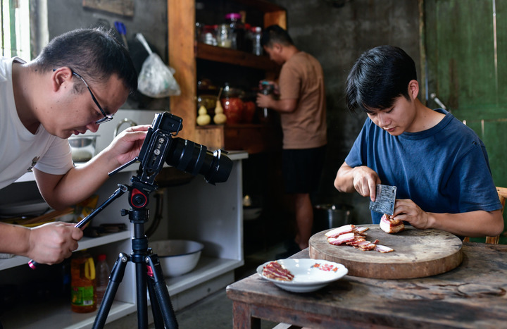 在贵州铜仁陈家寨村,“念乡人周周团队”在村里拍摄短视频。新华社记者 杨文斌 摄