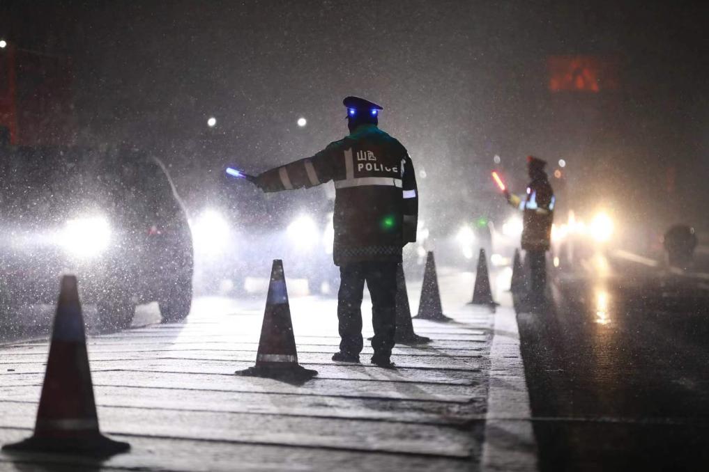 交警在雪天指挥车辆通行(资料图片)。 新华社发
