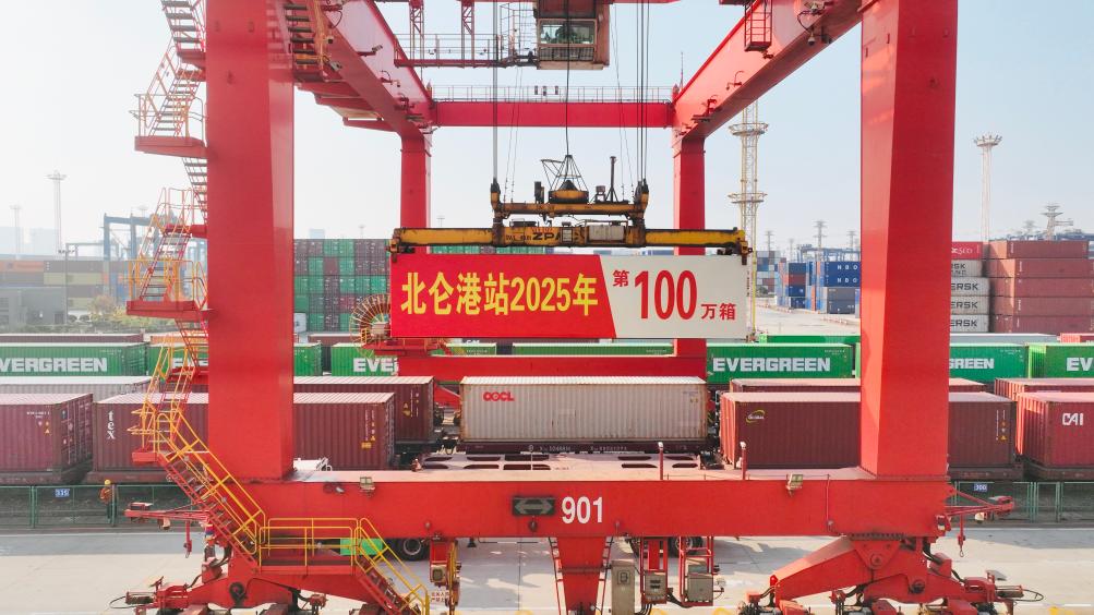 图为宁波舟山港北仑港站起吊今年第100万标准箱的作业场景。(宁波舟山港供图)