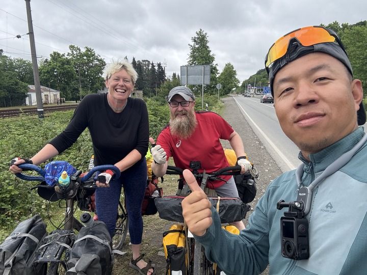 2025年5月29日,格鲁吉亚提比里西,程龙与途中偶遇的户外运动爱好者合影留念。(采访对象供图)