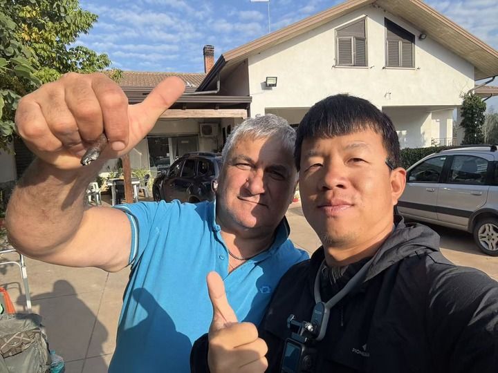 2025年9月30日,意大利贝内文托,程龙与留他住宿的肉铺老板合影留念。(采访对象供图)