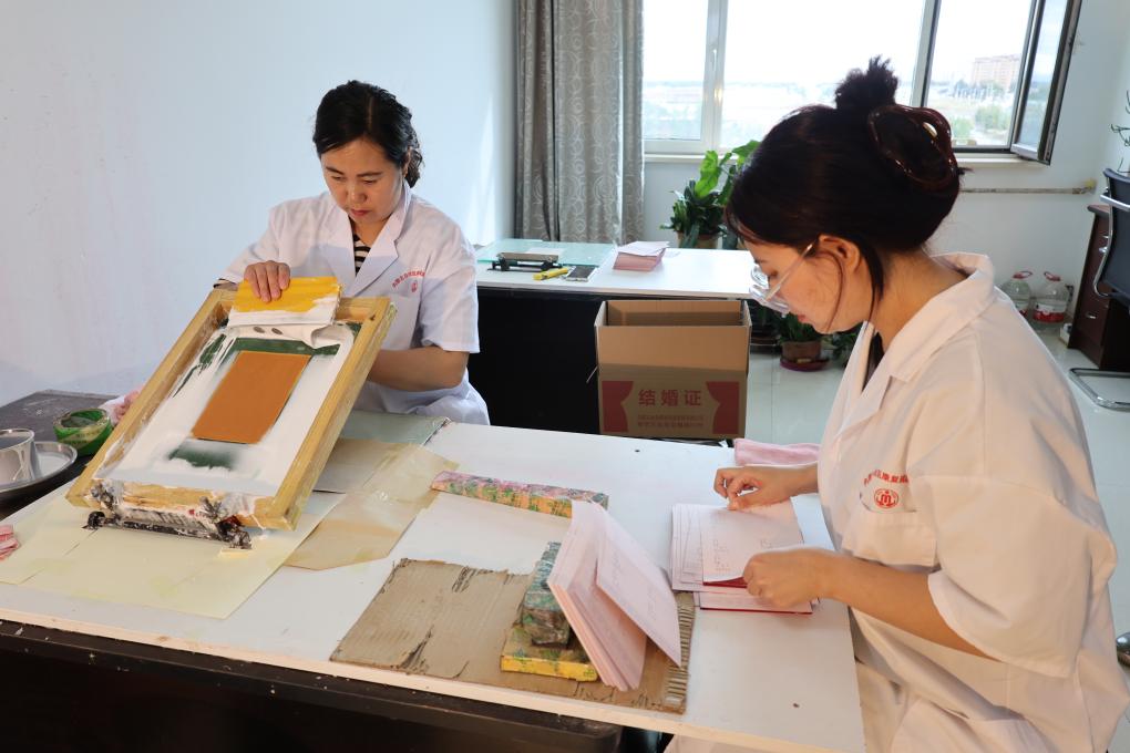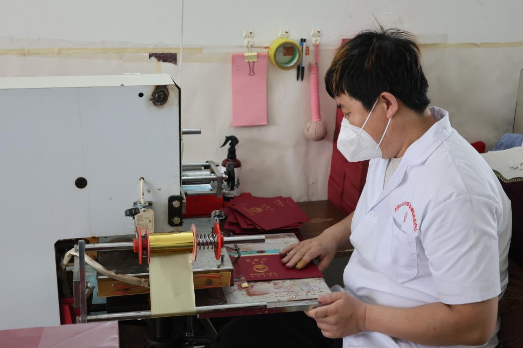 内蒙古金色阳光印务发展有限公司职工在糊裱结婚证。新华社发