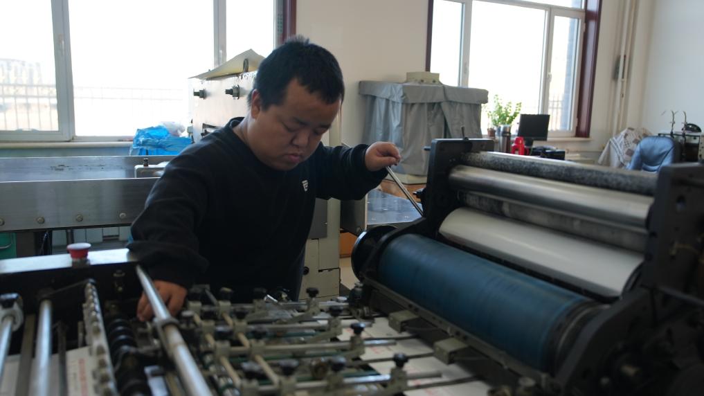 在胶印机旁,身高约1.2米的赵成龙正熟练地操作着。他时而调整水量,时而控制墨量,印出的纸张字迹清晰、墨色均匀。机器比他高出大半头,脚边那个用废旧纸张垒起的“台阶”,是他适应岗位的专属“装备”。
