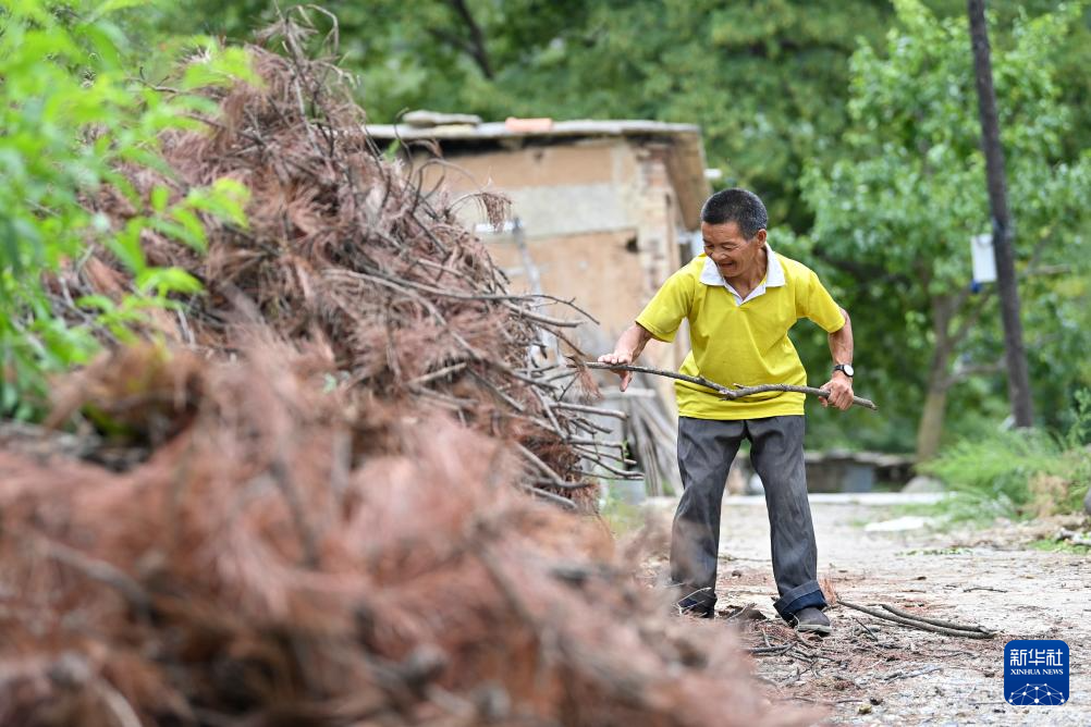 在山西省平顺县东寺头乡小南铺自然村,秦海松为村民元有才准备柴火(8月6日摄)。