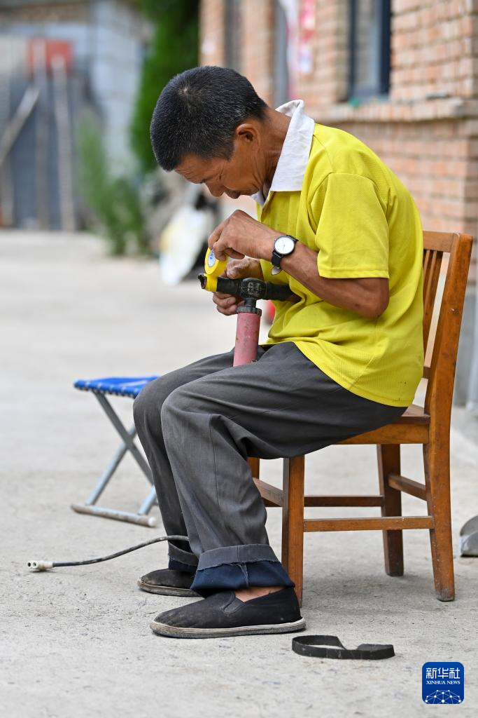 在山西省平顺县东寺头乡小南铺自然村,秦海松用胶带修补村民元有才家里的打气筒(8月6日摄)。