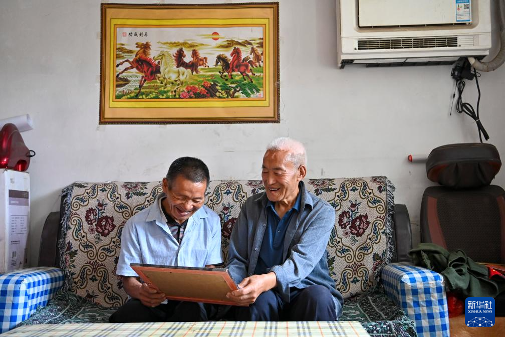 在山西省平顺县东寺头乡黄崖沟自然村,黄崖沟村前村支书桑春玉(右)和秦海松一起观看家里的老照片(8月27日摄)。