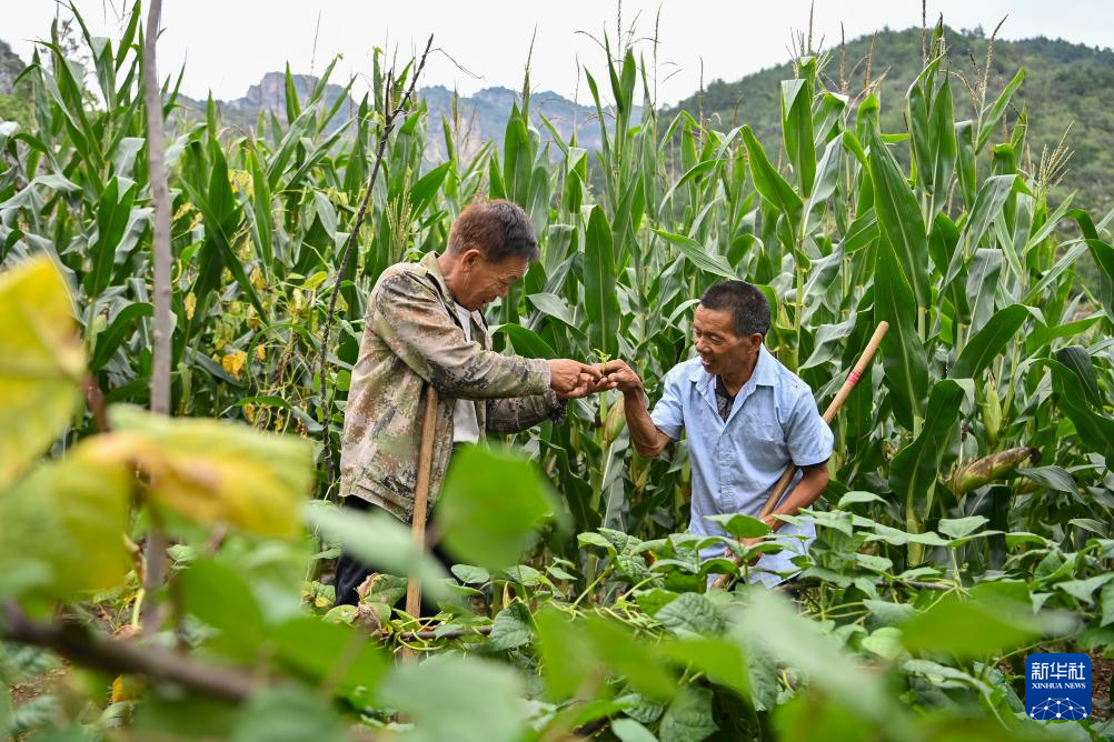 在山西省平顺县东寺头乡黄崖沟自然村,村民桑建平(左)为秦海松夹菜(8月27日摄)。