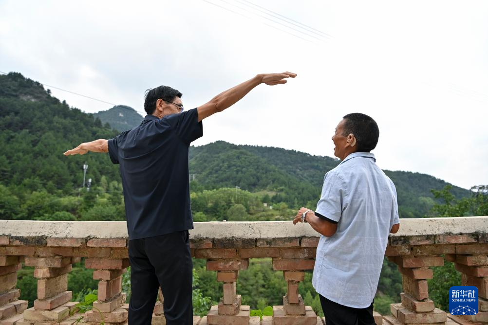 在山西省平顺县东寺头乡小南铺自然村,村民和秦海松(上)通过手势交流(8月6日摄)。