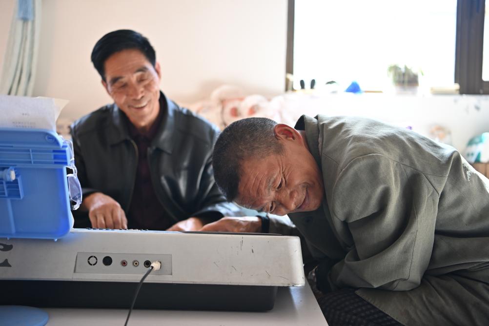 秦海松(右)在努力聆听琴键的声音。新华社记者杨晨光摄