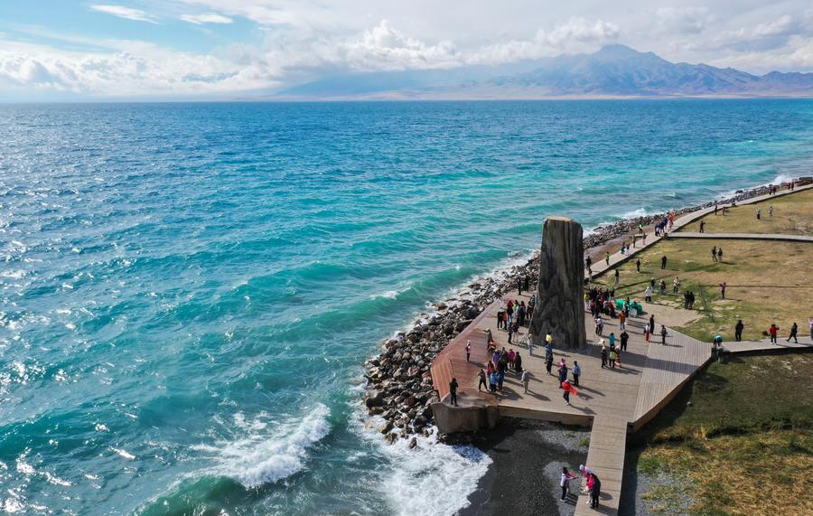游客在赛里木湖景区游览(2025年9月12日摄,无人机照片)。新华社记者 李贺 摄