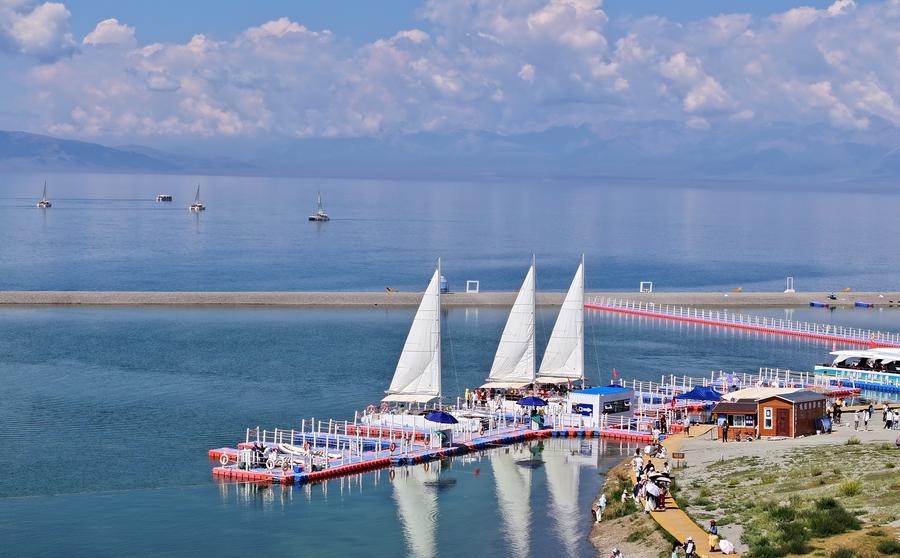 在赛里木湖景区,电动帆船在湖面开展游玩项目,为游客提供别样体验(2025年7月17日摄,无人机照片)。新华社发 (张利民 摄)