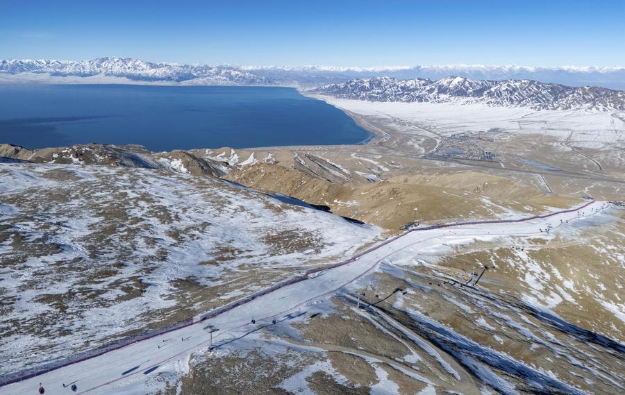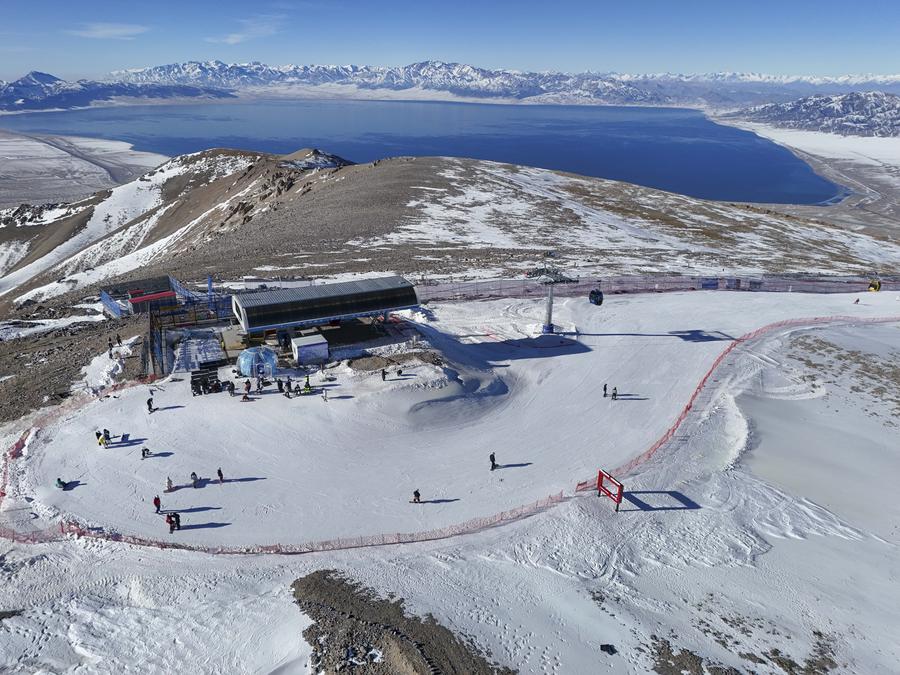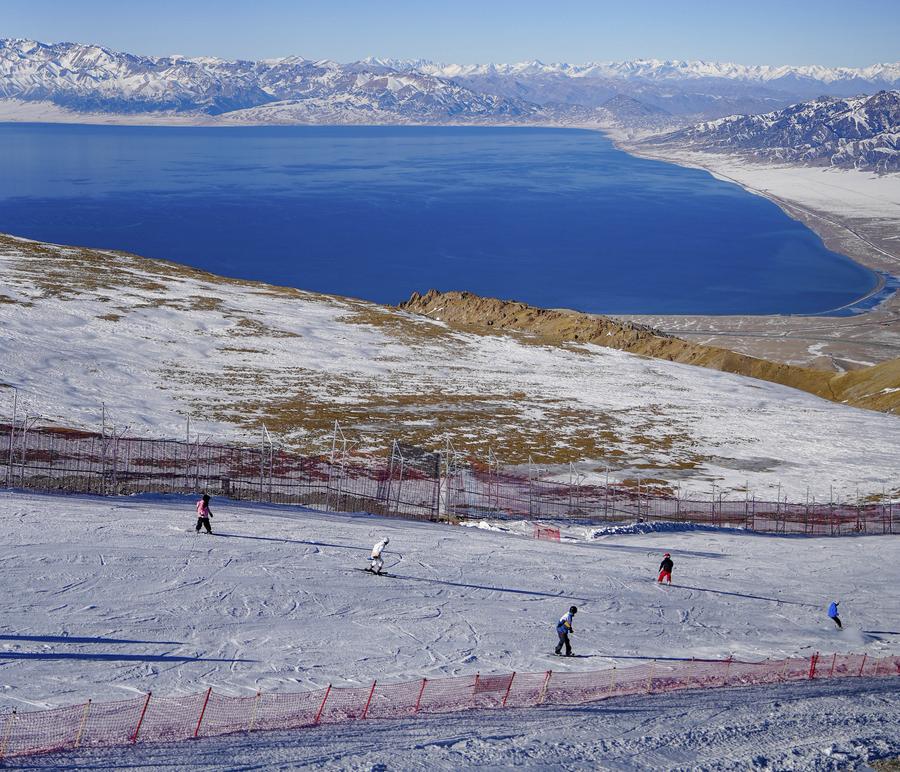 雪友在新疆赛里木湖滑雪场滑雪(2025年11月29日摄)。新华社记者 徐宏岩 摄