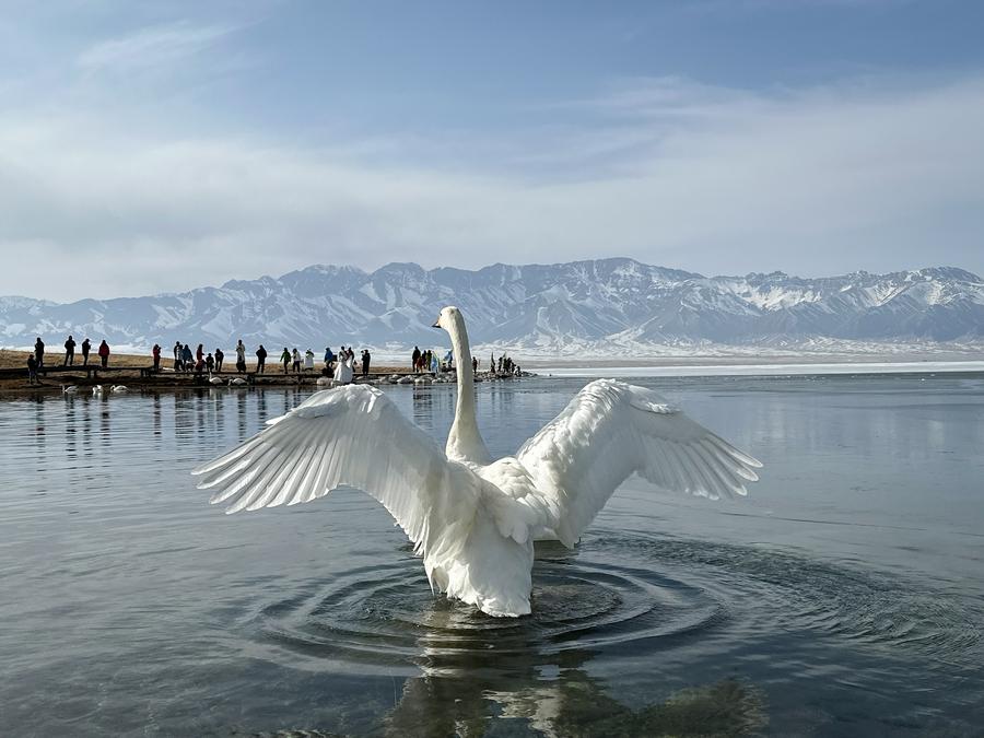 这是2023年4月6日拍摄的赛里木湖,湖中白天鹅游曳,不少游客在拍照留念。新华社记者 李响 摄
