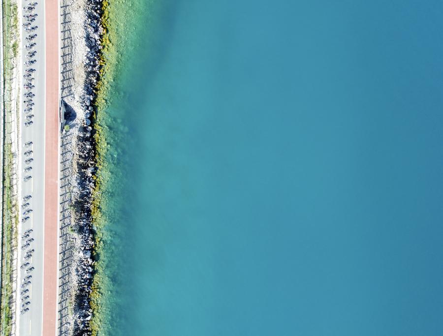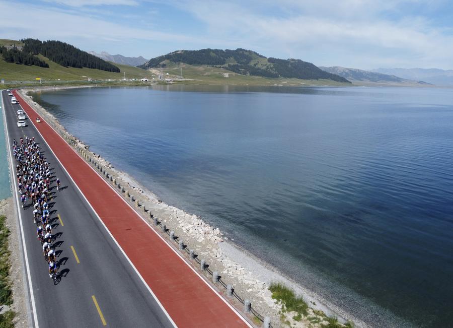 环赛里木湖公路自行车赛的参赛选手在比赛中(2022年7月26日,无人机拍摄)。新华社记者 郝建伟 摄