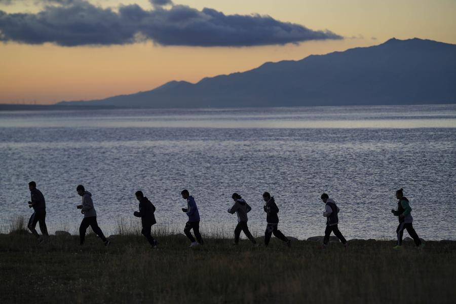 温泉县新疆残疾人中长跑训练基地的运动员在赛里木湖畔进行野外训练(2024年8月31日摄)。新华社记者 胡虎虎 摄
