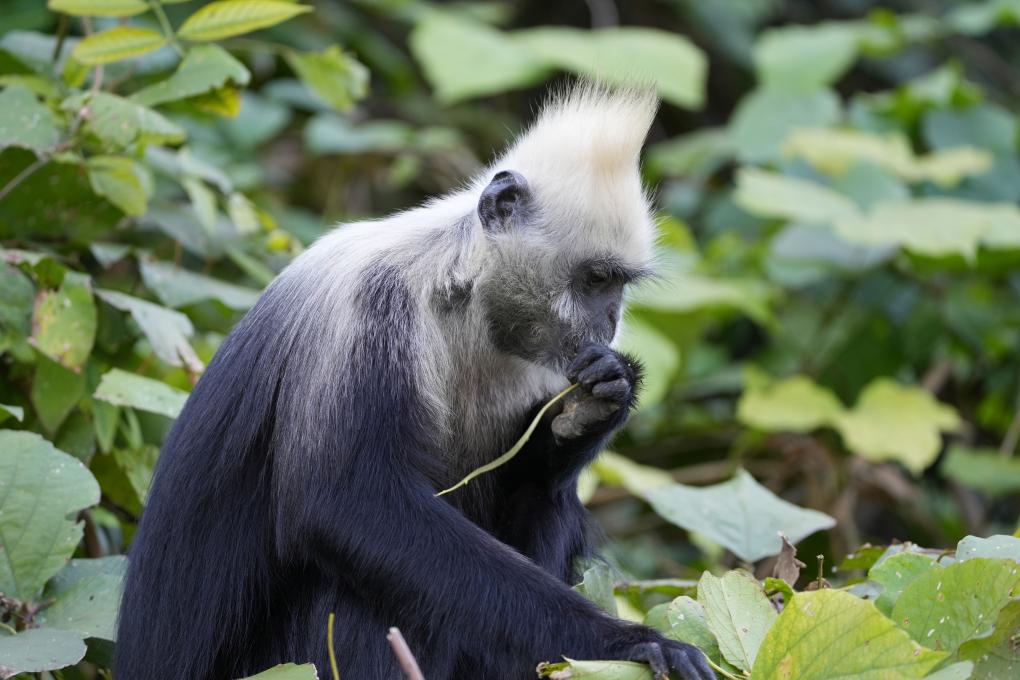 白头叶猴因头顶毛发呈白色、以树叶为食而得名。在广西崇左市江州区板利乡,绿意掩映的山林里,不时可见白头叶猴在嬉戏打闹、互相梳理毛发的场景。