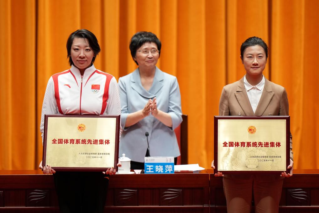 11月10日,北京市先农坛体育运动技术学校校长丁宁(右)、国家艺术体操队集体组教练孙丹(左)在全国群众体育先进及体育系统先进表彰大会上接受表彰。新华社记者 江汉 摄