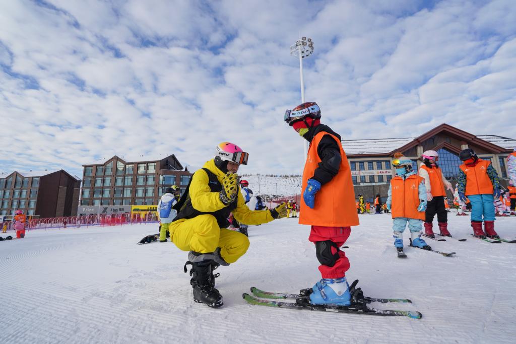 ↑滑雪教练在给学生讲解双板滑行技巧。新华社记者 阿曼 摄