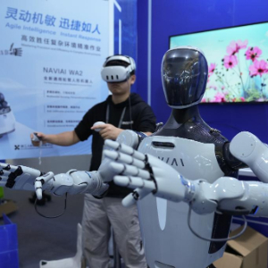 11月6日,在2025年世界互联网大会“互联网之光”博览会现场,一家企业工作人员展示人形机器人同步模仿精细动作。新华社记者 黄宗治 摄