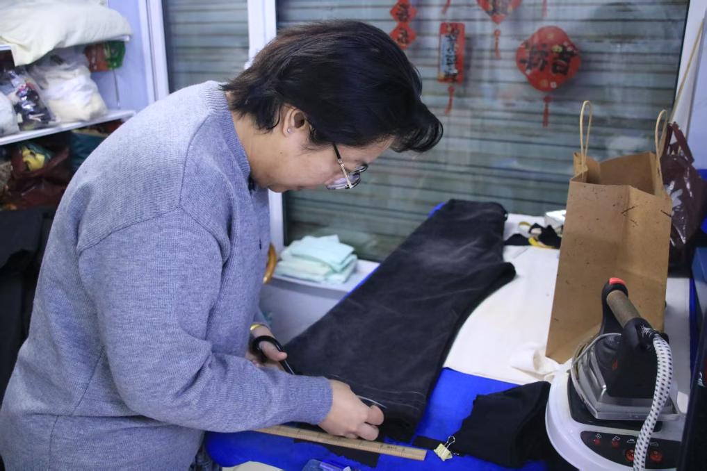 “春元织补改衣店”店主殷玥正在修补裤子。新华社记者曾晋 摄
