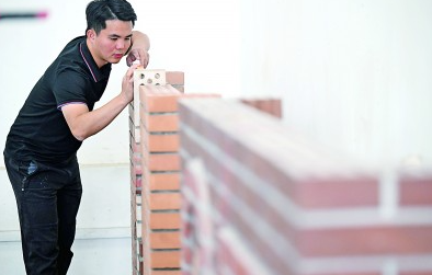在天津铁道职业技术学院砌筑集训基地,教师在给学生示范砌墙的动作要领。新华社发