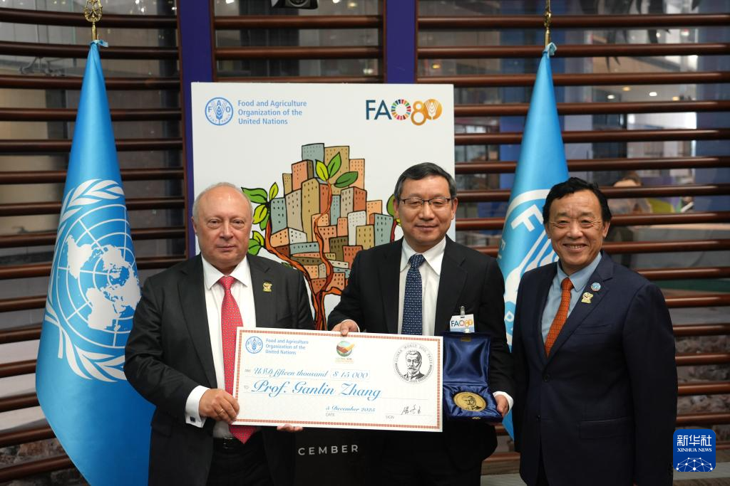 12月5日,在意大利首都罗马,联合国粮农组织总干事屈冬玉(右)向张甘霖(中)颁授2025年格林卡世界土壤奖奖牌。新华社记者 任耀庭 摄