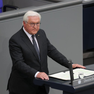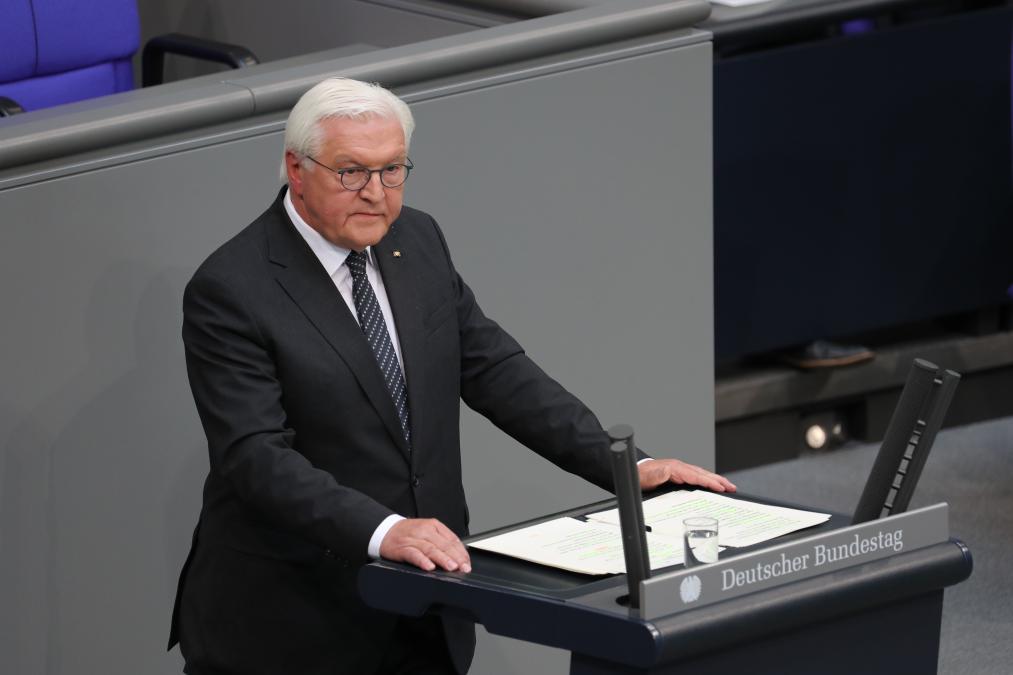 5月8日,德国总统施泰因迈尔在首都柏林国会大厦举行的纪念活动上致辞。新华社记者杜哲宇摄