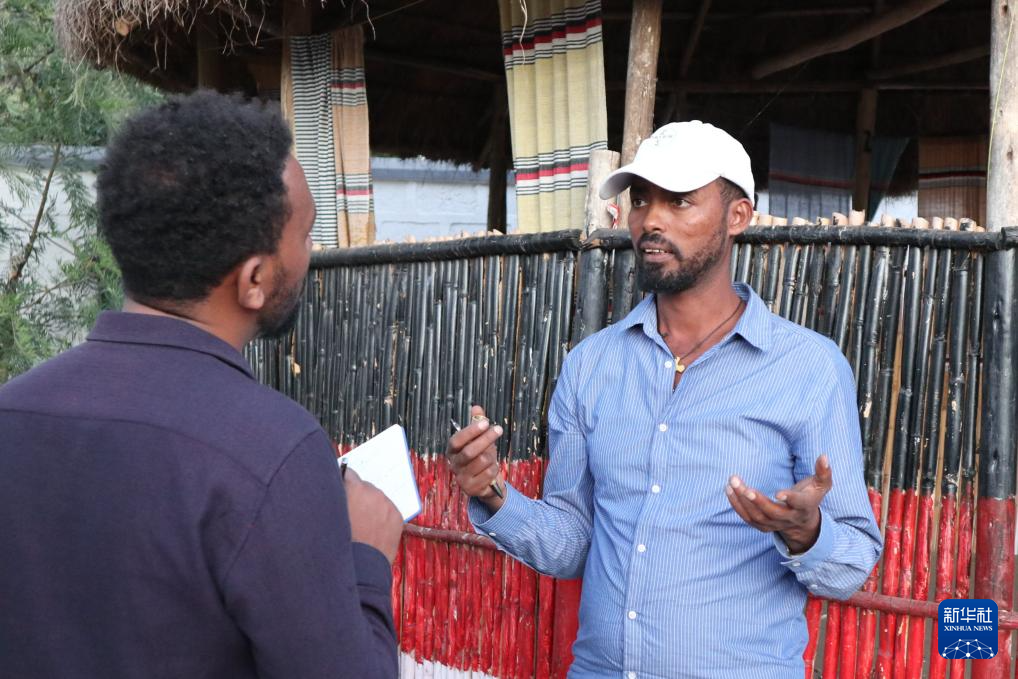 11月26日,在埃塞俄比亚奥罗米亚州的戈迪诺村,戈迪诺村负责人阿塞法·古迪萨(右)接受采访。新华社记者 刘方强 摄